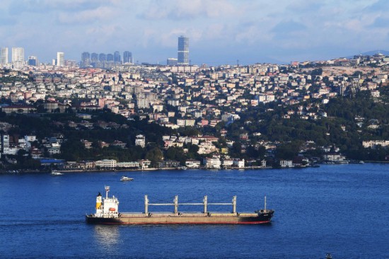 2022年8月7日,一艘從烏克蘭出發(fā)的運糧船駛過土耳其伊斯坦布爾博斯普魯斯海峽。新華社記者沙達提攝