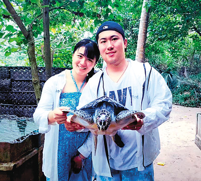許振軒(右)與李丹宜在斯里蘭卡體驗了一場特殊的“海龜保育義工之旅”。