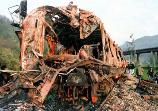 1999年3月24日,以美國(guó)為首的北約向南斯拉夫聯(lián)盟開始發(fā)動(dòng)大規(guī)模空襲,武力干涉科索沃危機(jī)。資料照片顯示被北約飛機(jī)炸毀的火車。新華社發(fā)