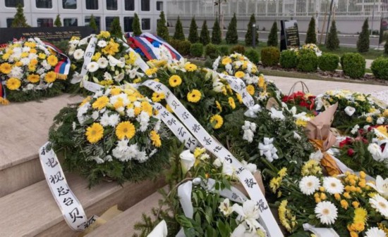 這是2022年5月7日在塞爾維亞貝爾格萊德的中國(guó)駐南斯拉夫聯(lián)盟大使館舊址紀(jì)念碑前拍攝的花圈。新華社發(fā)(王韡 攝)