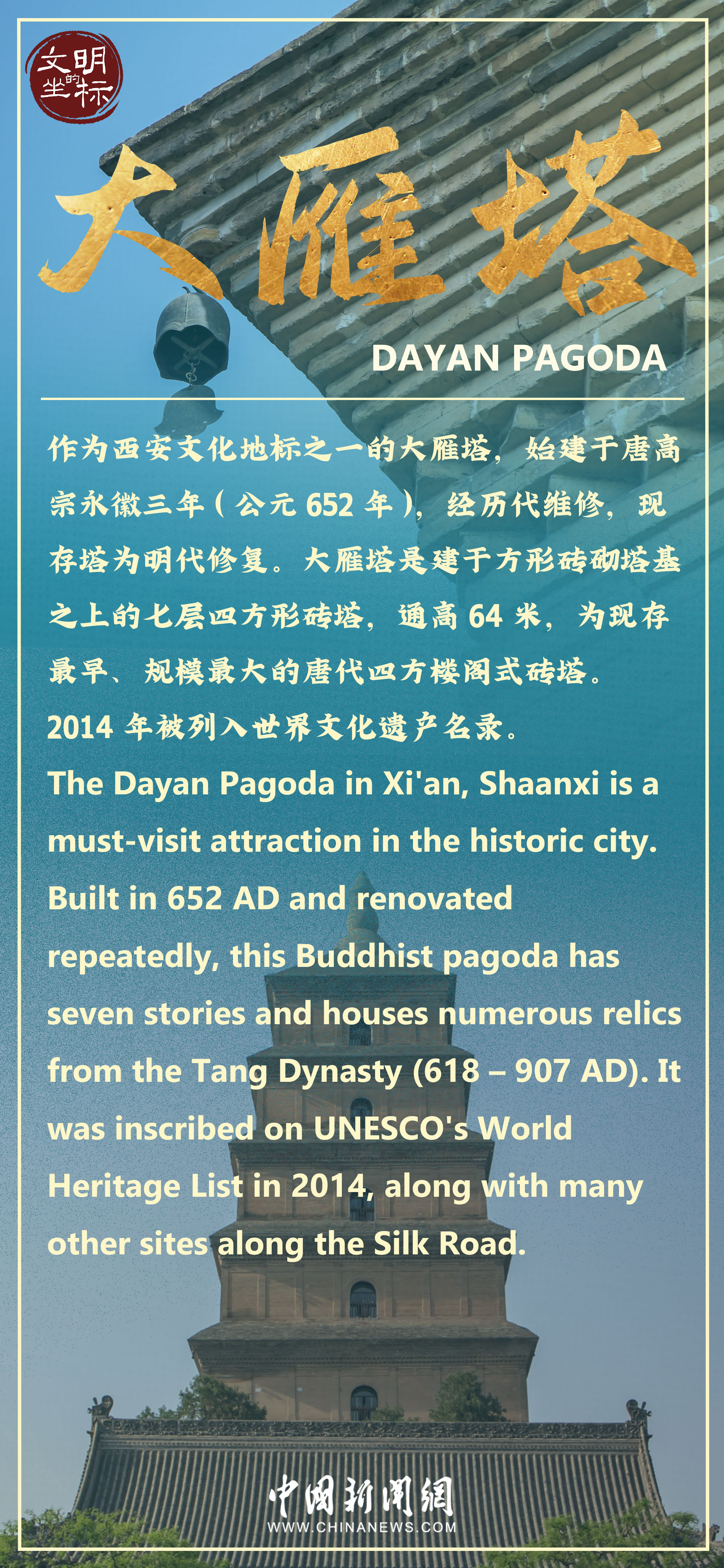 大雁塔又稱大慈恩寺塔,位于陜西省西安市雁塔區(qū),始建于唐高宗永徽三年(公元652年),為七層四方樓閣式磚塔。大雁塔現(xiàn)塔身通高64米,是為保存玄奘法師經(jīng)絲綢之路帶回長(zhǎng)安的經(jīng)卷佛像而建,塔下碑文記述和佐證了大雁塔與絲綢之路佛教傳播的歷史。整個(gè)建筑氣魄宏大,莊嚴(yán)古樸,是唐代建筑藝術(shù)的杰作。走近大雁塔,感受“塔勢(shì)如涌出,孤高聳天宮”的氣勢(shì),觸摸“曲江流飲,雁塔題名”的歷史文脈。