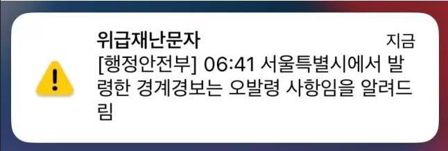 行政安全部澄清稱,首爾地區(qū)并不在警報(bào)范圍內(nèi),首爾市政府發(fā)布的危急災(zāi)害通知短信屬于誤報(bào)。行安部已于上午7點(diǎn)3分許發(fā)布短信告知稱,首爾地區(qū)發(fā)布預(yù)警信息系工作失誤。