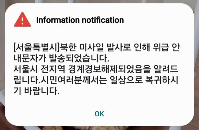 7時(shí)26分左右,首爾市再次發(fā)布通知稱,“由于朝鮮發(fā)射導(dǎo)彈,發(fā)送了危急災(zāi)害通知。在此通知,首爾市整個(gè)地區(qū)的警戒警報(bào)已經(jīng)解除。希望各位市民回到日常生活中去。”