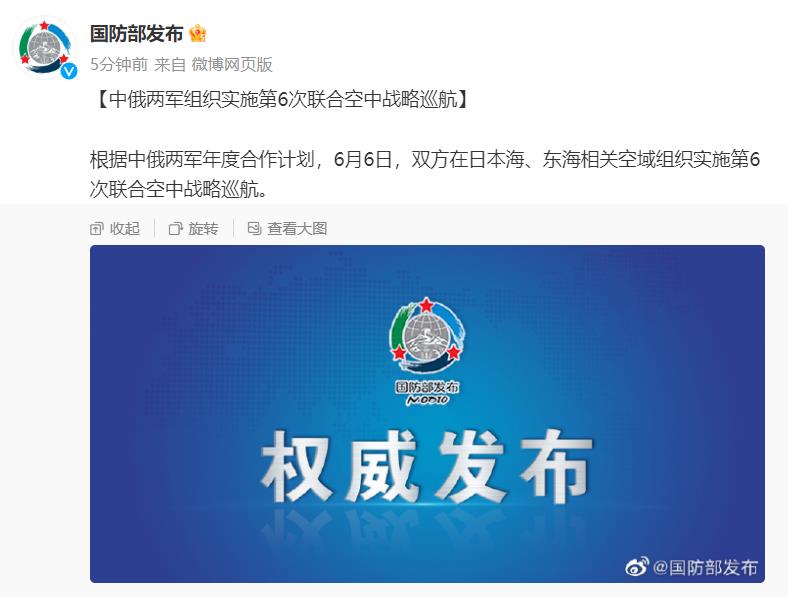 中新網6月6日電 據(jù)國防部新聞局官方微博消息,根據(jù)中俄兩軍年度合作計劃,6月6日,雙方在日本海、東海相關空域組織實施第6次聯(lián)合空中戰(zhàn)略巡航。