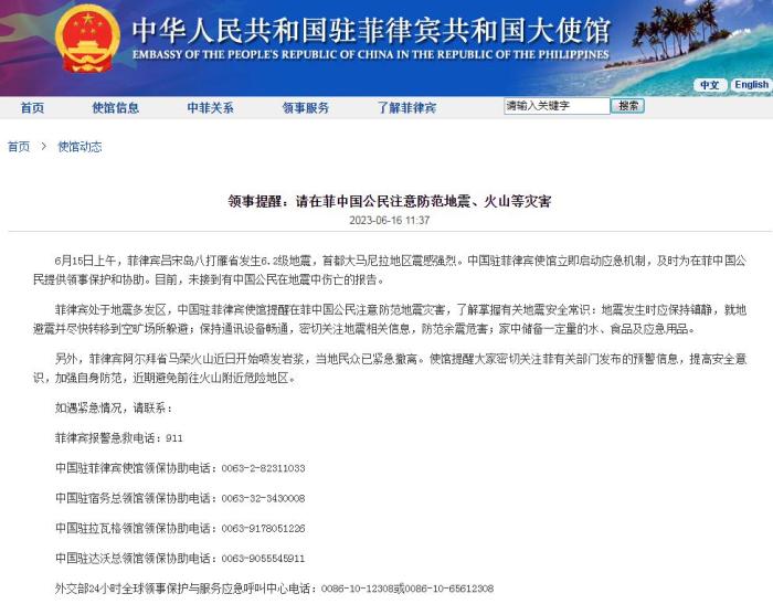 中新網(wǎng)6月16日電 據(jù)中國(guó)駐菲律賓大使館網(wǎng)站消息,6月15日上午,菲律賓呂宋島八打雁省發(fā)生6.2級(jí)地震,首都大馬尼拉地區(qū)震感強(qiáng)烈。中國(guó)駐菲律賓使館立即啟動(dòng)應(yīng)急機(jī)制,及時(shí)為在菲中國(guó)公民提供領(lǐng)事保護(hù)和協(xié)助。目前,未接到有中國(guó)公民在地震中傷亡的報(bào)告。