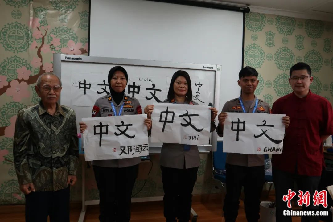 2023年3月,印尼阿拉扎大學孔子學院為印尼國家警察語言學院的警員們開展系列中國文化活動。如今越來越多的印尼公職人員開始學習中文。圖為印尼警察展示中國書法作品。李志全 攝