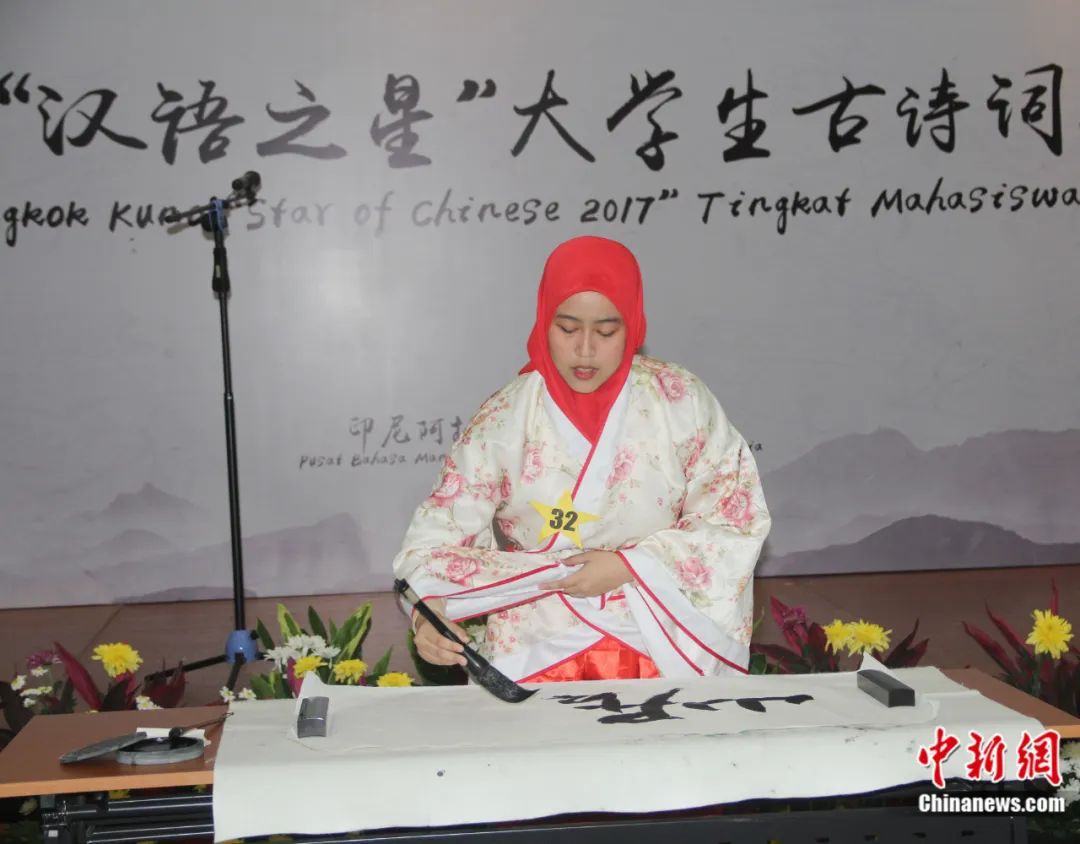 由中國孔子學院總部/國家漢辦主辦、印尼阿拉扎大學孔子學院承辦的2017“漢語之星”大學生古詩詞大賽在雅加達舉行。圖為印尼選手表演中國書法。林永傳 攝