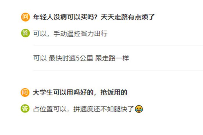 中新財(cái)經(jīng)注意到,在電商平臺上電動(dòng)輪椅的問答區(qū),不少消費(fèi)者都對電動(dòng)輪椅展現(xiàn)出了濃厚的興趣,“年輕人沒病可以買嗎?天天走路有點(diǎn)煩了?!薄按髮W(xué)生可以用嗎?”“食堂搶飯用!神器?!薄澳贻p人也可以用,省力出行?!?/p>