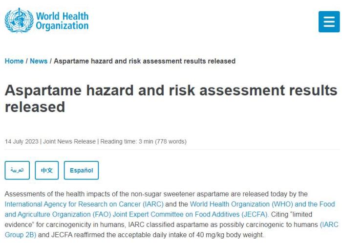 近期以來,“阿斯巴甜致癌”爭議引起廣泛關(guān)注。14日,世衛(wèi)組織官網(wǎng)上發(fā)布消息,國際癌癥研究機(jī)構(gòu)(IARC)、世界衛(wèi)生組織和聯(lián)合國糧食及農(nóng)業(yè)組織(FAO)食品添加劑聯(lián)合專家委員會(JECFA)發(fā)布了阿斯巴甜對健康影響的評估結(jié)果。