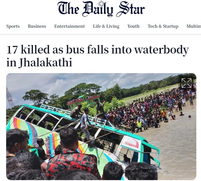 據(jù)報道,當(dāng)?shù)貢r間22日上午約9:45分,在達(dá)卡以南約200公里的恰洛加蒂縣,一輛大巴掉入水中。當(dāng)?shù)鼐椒Q,死者中包括至少8名婦女和3名兒童。