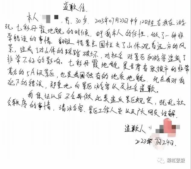 通報表示,該游客進(jìn)入?yún)^(qū)域是張掖世界地質(zhì)公園彩色丘陵保護(hù)范圍,雖然因其行走的山脊被黃土覆蓋,未造成實(shí)質(zhì)性損害,但其行為違反了《張掖七彩丹霞保護(hù)條例》和《治安管理處罰法》相關(guān)規(guī)定。7月24日16:50該游客從旅游途中返回臨澤縣,接受相關(guān)部門調(diào)查處理。市、縣林草部門對該游客進(jìn)行了嚴(yán)肅的批評教育;丹霞景區(qū)派出所依據(jù)《治安管理處罰法》對該游客處以200元罰款;該游客深刻認(rèn)識到自身行為的錯誤性和嚴(yán)重性,并公開致歉。