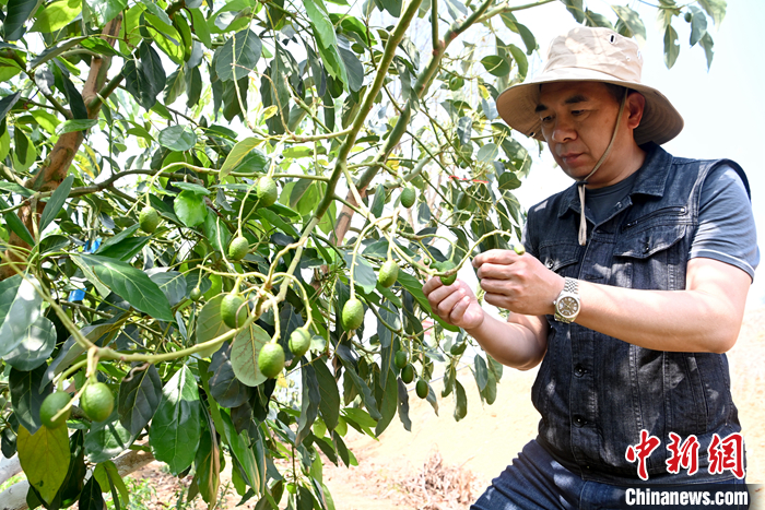 圖為4月27日,汪志哲檢查牛油果長勢(shì)。 中新社記者 李嘉嫻 攝