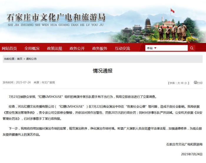 中新網(wǎng)7月25日電 據(jù)石家莊市文化廣電和旅游局網(wǎng)站消息,7月23日接群眾舉報,“紅糖LIVEHOUSE”組織的商演中某樂隊歌手有不當(dāng)行為,石家莊市文化廣電和旅游局立即依法進行了立案調(diào)查。
