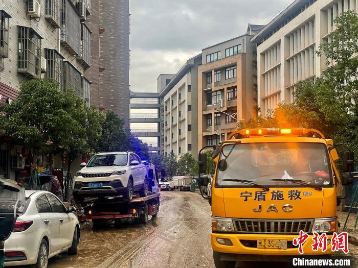 沿著中心街道往里走,越往里,積水退去后的殘留淤泥越多。街道兩側(cè),不時(shí)可看見堆放著不少被積水浸泡過后、無法使用的家具、生活用品以及貨物等,救援車將一部部受損車輛拖離現(xiàn)場。