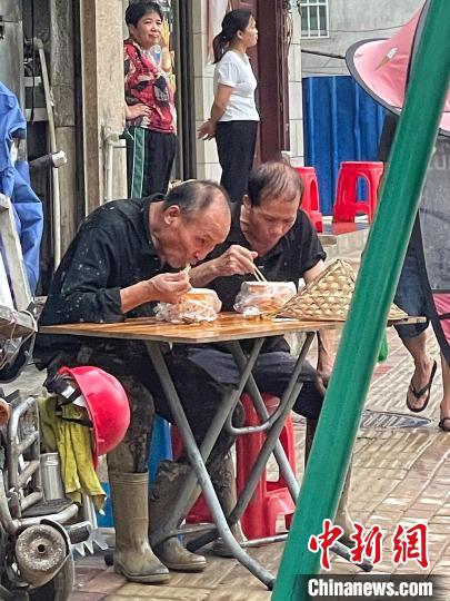 村中,七旬的吳大爺和數(shù)名年齡相近的村民,已自發(fā)幫助清理村中街道長達(dá)11個(gè)小時(shí)。17時(shí)許,吳大爺在街邊攤位吃著面條,稍作歇息后,他將重新投入清理工作。