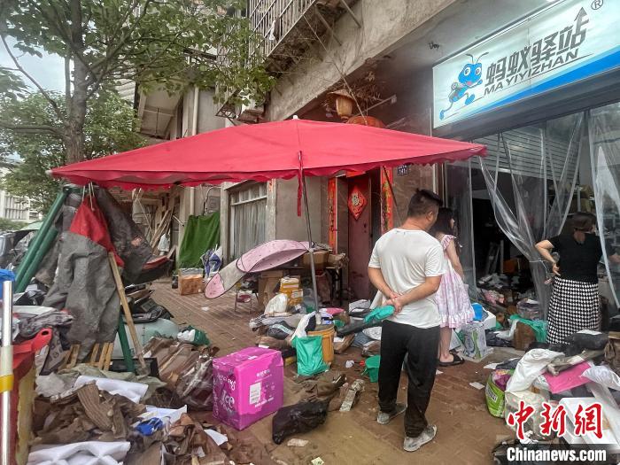 馮先生在蘭田村內(nèi)經(jīng)營一家砂鍋米線店,積水退去,店內(nèi)人員正在清理器具,門口堆放著大量損失物品。呂巧琴 攝