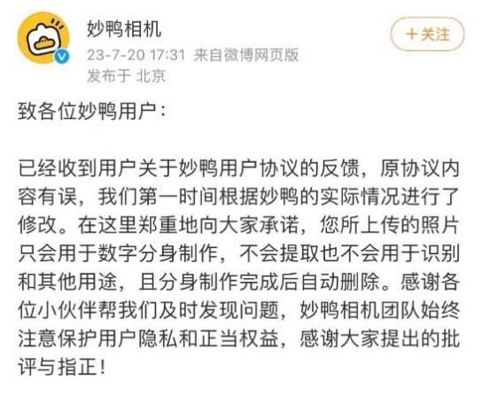對此,妙鴨相機(jī)在7月20日回應(yīng)稱,原協(xié)議內(nèi)容有誤,并第一時間刪除了相關(guān)條款。