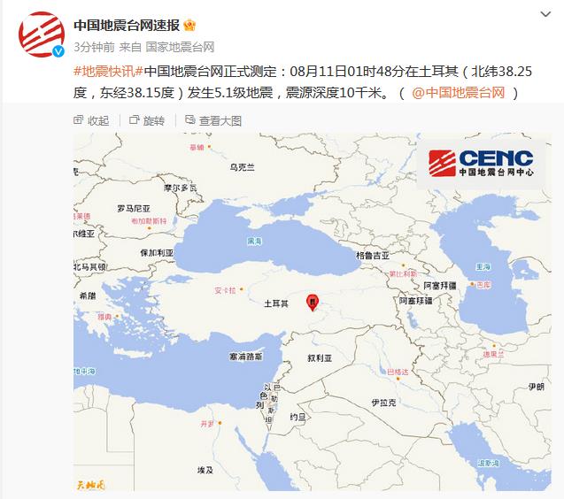 中新網(wǎng)8月11日電 據(jù)國家地震臺網(wǎng)官方微博消息,中國地震臺網(wǎng)正式測定:8月11日01時(shí)48分在土耳其(北緯38.25度,東經(jīng)38.15度)發(fā)生5.1級地震,震源深度10千米。