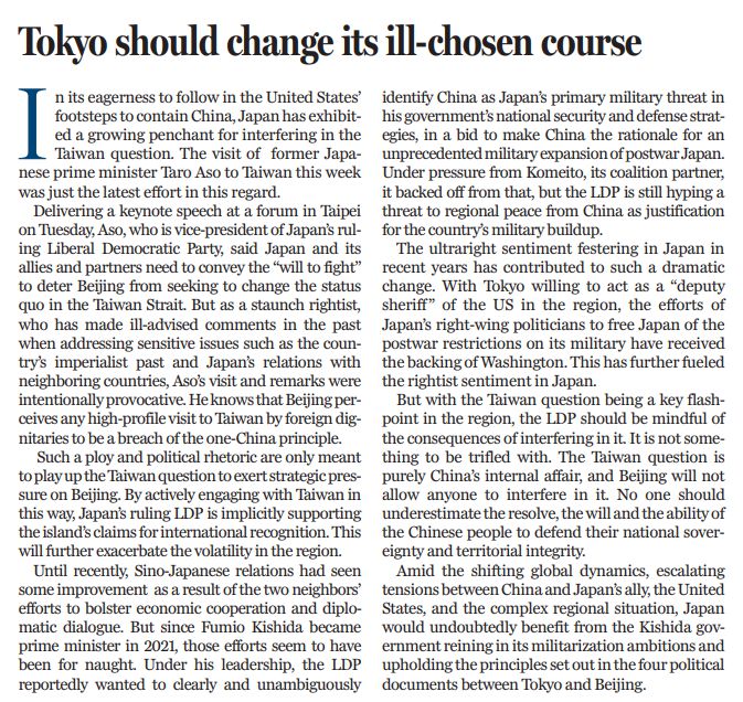 身為日本執(zhí)政的自民黨副總裁,麻生太郎周二在臺發(fā)表演講,口出狂言,大放厥詞,說什么日本及其盟友和伙伴要對外傳達(dá)“戰(zhàn)斗意志”。作為頑固的右翼分子,麻生竄臺和上述言論完全是蓄意挑釁。任何外國政要高調(diào)竄臺都違反一個(gè)中國原則,都是對中國內(nèi)政的粗暴干涉。對此,麻生心知肚明,明知故犯,就是為了渲染臺灣問題,向北京施加戰(zhàn)略壓力。通過與臺積極接觸,日方明里暗里支持臺當(dāng)局企圖獲得國際承認(rèn)的癡心妄想,將進(jìn)一步加劇地區(qū)動(dòng)蕩。