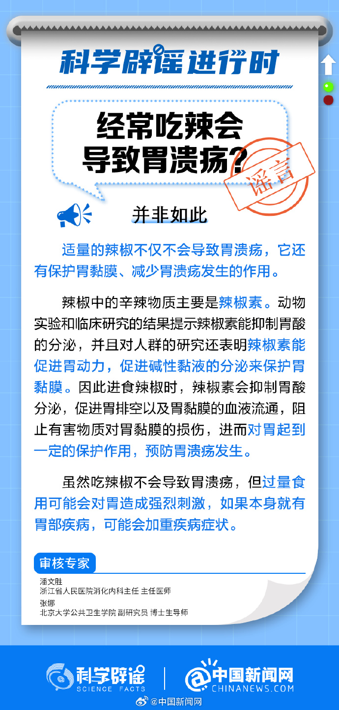 中新網(wǎng)8月23日電 適量的辣椒不僅不會(huì)導(dǎo)致胃潰瘍,它還有保護(hù)胃黏膜、減少胃潰瘍發(fā)生的作用。辣椒中的辣椒素會(huì)抑制胃酸分泌,促進(jìn)胃排空以及胃黏膜的血液流通,阻止有害物質(zhì)對(duì)胃黏膜的損傷,進(jìn)而對(duì)胃起到一定的保護(hù)作用,預(yù)防胃潰瘍發(fā)生。但過(guò)量食用辣椒可能會(huì)對(duì)胃造成強(qiáng)烈刺激,如果本身就有胃部疾病,可能會(huì)加重疾病癥狀。(來(lái)源:@科學(xué)辟謠 @中國(guó)新聞網(wǎng) )