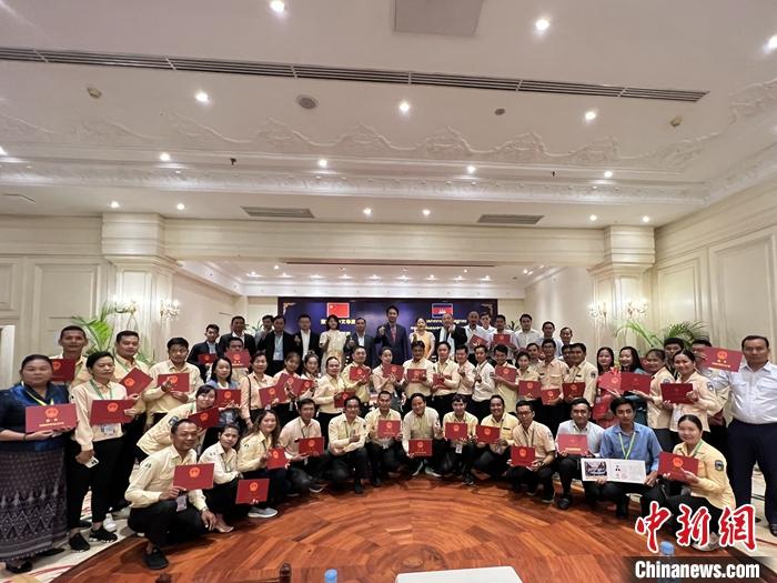 8月21日至30日,柬埔寨中文導(dǎo)游海外培訓(xùn)班在暹粒舉行,來(lái)自金邊和暹粒兩地的60名中文導(dǎo)游及旅游從業(yè)者參加培訓(xùn)學(xué)習(xí)。圖為8月30日,柬埔寨中文導(dǎo)游海外培訓(xùn)班結(jié)業(yè)典禮。 中新社發(fā) 項(xiàng)目團(tuán)隊(duì)供圖