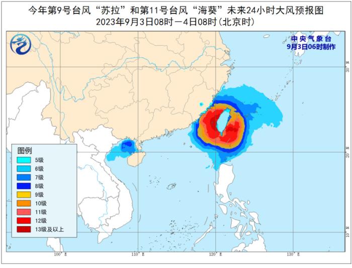 9月3日08時(shí)至4日08時(shí),內(nèi)蒙古東北部、吉林西部、廣西中南部、廣東西南部、臺(tái)灣島大部等地部分地區(qū)有中到大雨,其中,廣西中部、臺(tái)灣島中東部等地部分地區(qū)有暴雨或大暴雨,臺(tái)灣島東部部分地區(qū)有特大暴雨(250~600毫米)。浙江東南部、福建東部沿海部分地區(qū)有5~7級(jí)風(fēng)。北部灣、瓊州海峽、東海南部、臺(tái)灣以東洋面、臺(tái)灣海峽、巴士海峽、南海東北部有6~8級(jí)大風(fēng)、陣風(fēng)10~11級(jí),其中臺(tái)灣以東洋面、臺(tái)灣海峽、巴士海峽北部、南海東北部部分海域風(fēng)力可達(dá)9~11級(jí)、陣風(fēng)13~14級(jí)。