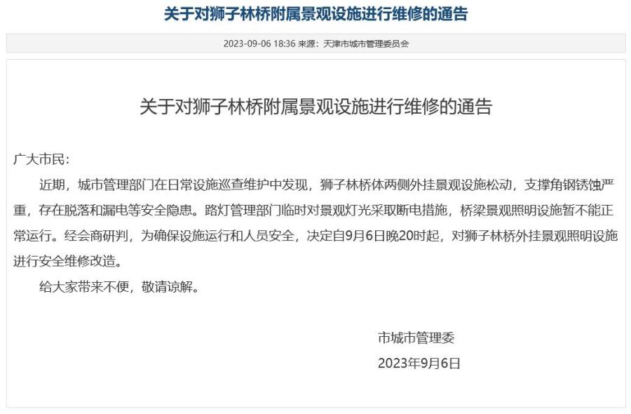 中新網9月7日電 6日,天津市城市管理委員會發(fā)出通告,對獅子林橋附屬景觀設施進行維修。天津市城市管理委表示,近期,城市管理部門在日常設施巡查維護中發(fā)現,獅子林橋體兩側外掛景觀設施松動,支撐角鋼銹蝕嚴重,存在脫落和漏電等安全隱患。路燈管理部門臨時對景觀燈光采取斷電措施,橋梁景觀照明設施暫不能正常運行。經會商研判,為確保設施運行和人員安全,決定自9月6日晚20時起,對獅子林橋外掛景觀照明設施進行安全維修改造。