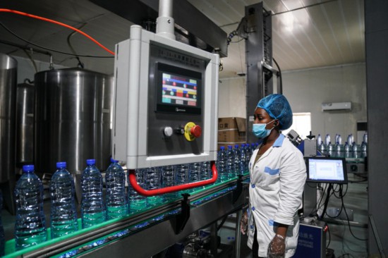 9月9日,當(dāng)?shù)貑T工在位于加蓬首都利伯維爾的歐來(lái)源純凈水廠生產(chǎn)線上工作。新華社記者韓旭攝