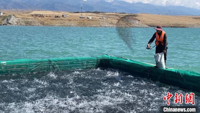 9月9日,記者來到位于新疆伊犁尼勒克縣喀拉蘇鄉(xiāng)的三文魚養(yǎng)殖基地。圖為養(yǎng)殖工向網箱中的虹鱒魚拋撒餌料。中新社記者 朱賀 攝