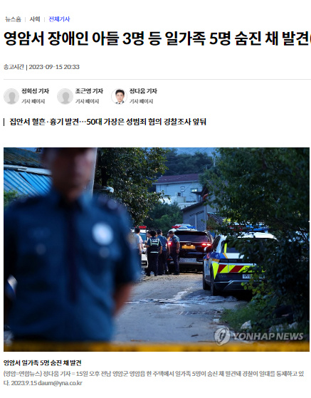 據(jù)報道,15日下午3時54分,韓國警察廳接到了關(guān)于全羅南道靈巖郡金某住宅窗戶上有血跡的報警。當(dāng)?shù)鼐脚c消防急救隊一同前往,進(jìn)入該住宅后發(fā)現(xiàn)了金某、金某妻子以及金某夫婦的三名20多歲兒子的尸體。