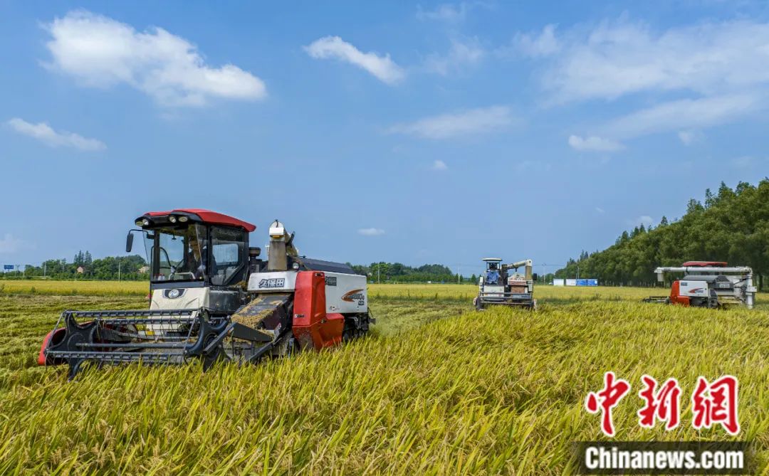 安徽省合肥市廬江縣廣寒村河廣家庭農(nóng)場,農(nóng)機手操作農(nóng)機在大田里收割早稻。左學(xué)長 攝