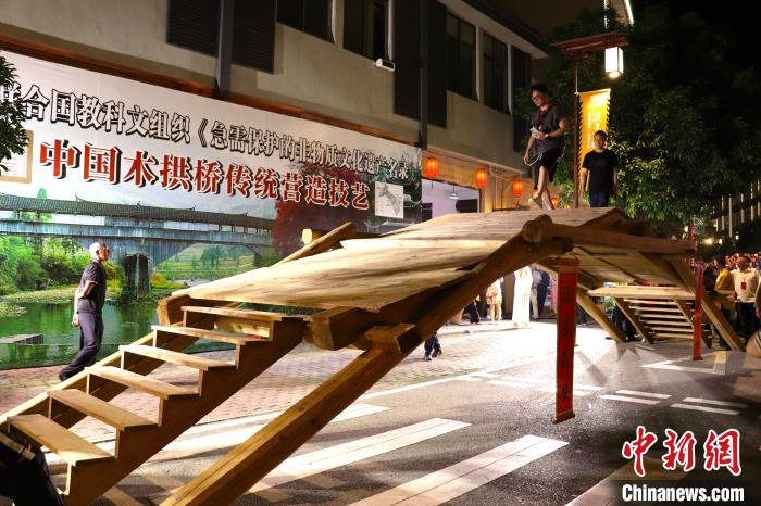 木拱廊橋傳統(tǒng)營(yíng)造技藝展示現(xiàn)場(chǎng),游客登橋行走。中新網(wǎng)記者 葉茂 攝