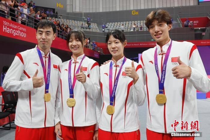 9月25日晚,杭州第19屆亞運會跆拳道競技混合團(tuán)體賽決賽在臨安體育文化會展中心體育館舉行。中國隊以84比77戰(zhàn)勝韓國隊,獲得冠軍。圖為冠軍中國選手宋兆祥、周澤琪、宋潔、崔陽(從左至右)在頒獎儀式后合影。