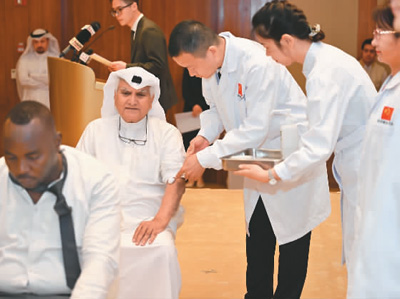 中國(吉林)第15批援科威特醫(yī)療隊(duì)在展示針灸治療。