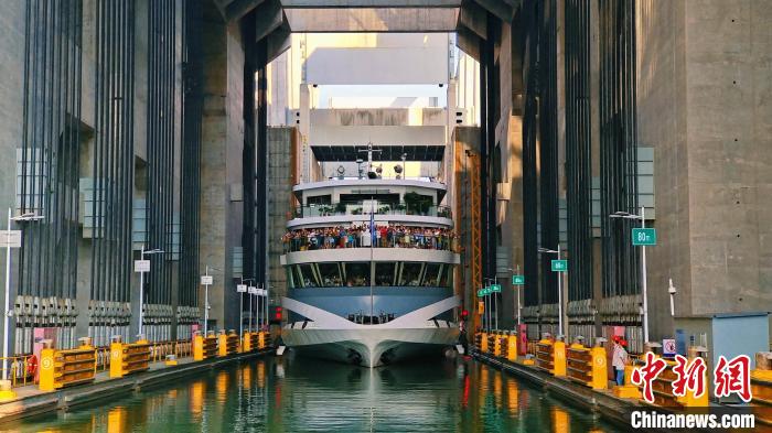 船舶乘坐三峽升船機(jī)翻越三峽大壩。三峽通航管理局供圖