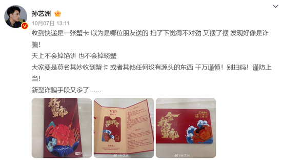 10月7日,演員孫藝洲在微博發(fā)文稱(chēng),“收到快遞是一張蟹卡,以為是哪位朋友送的。掃了下覺(jué)得不對(duì)勁,又搜了搜。發(fā)現(xiàn)好像是詐騙!天上不會(huì)掉餡餅,也不會(huì)掉螃蟹。大家要是莫名其妙收到蟹卡,或者其他任何沒(méi)有源頭的東西,千萬(wàn)謹(jǐn)慎!別掃碼!謹(jǐn)防上當(dāng)!新型詐騙手段又多了……”