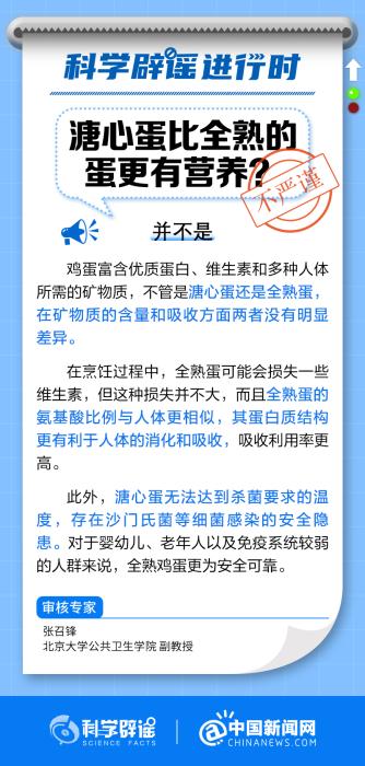 中新網(wǎng)10月20日電 溏心蛋和全熟蛋在礦物質(zhì)的含量和吸收方面沒有明顯差異。在烹飪過程中,全熟蛋可能會(huì)損失一些維生素,但這種損失并不大,而且全熟蛋的氨基酸比例與人體更相似,其蛋白質(zhì)結(jié)構(gòu)更有利于人體的消化和吸收。此外,溏心蛋無(wú)法達(dá)到殺菌要求的溫度,存在沙門氏菌等細(xì)菌感染的安全隱患。(來源:@科學(xué)辟謠 @中國(guó)新聞網(wǎng) )