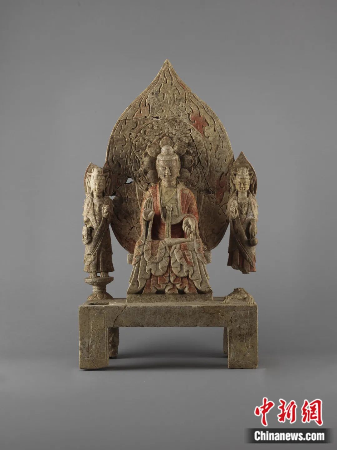 何利群:“譚副造釋迦像”殘高1.28米,主尊高77.7厘米,青石材質,是一尊一佛二菩薩背屏式造像,通體彩繪貼金。它由數十件碎塊拼接綴合而成,是鄴城地區(qū)出土時代最早的北魏造像之一,也是其中形體較大的一件。