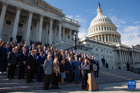 10月25日,在美國華盛頓國會(huì),新當(dāng)選的眾議院議長(zhǎng)邁克·約翰遜(后右)發(fā)表講話。新華社發(fā)(亞倫攝)