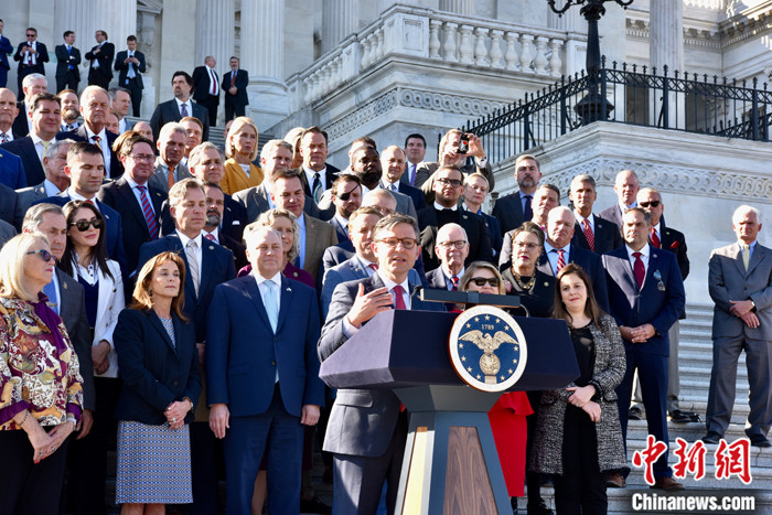圖為約翰遜當(dāng)選議長后在記者會上表示,過去幾周的議長選舉讓共和黨人“更強(qiáng)大”,“我們將立刻全力以赴開始工作”。 中新社記者 沙晗汀 攝