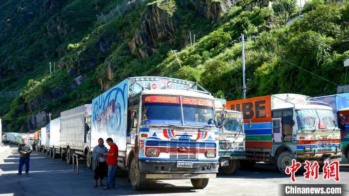 2018年7月26日,西藏自治區(qū)日喀則吉隆口岸,尼泊爾車輛排隊等待通關(guān)。(資料圖) 中新社記者 江飛波 攝