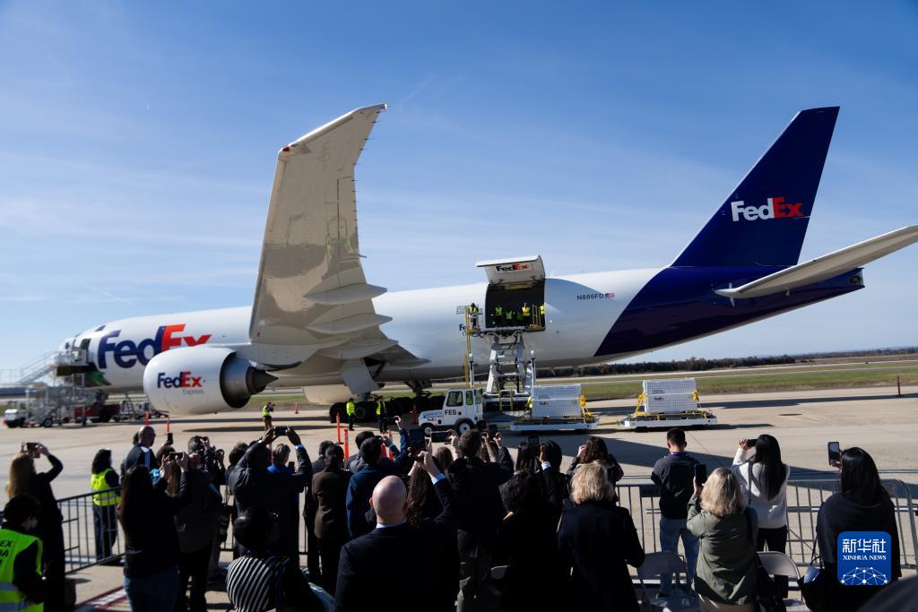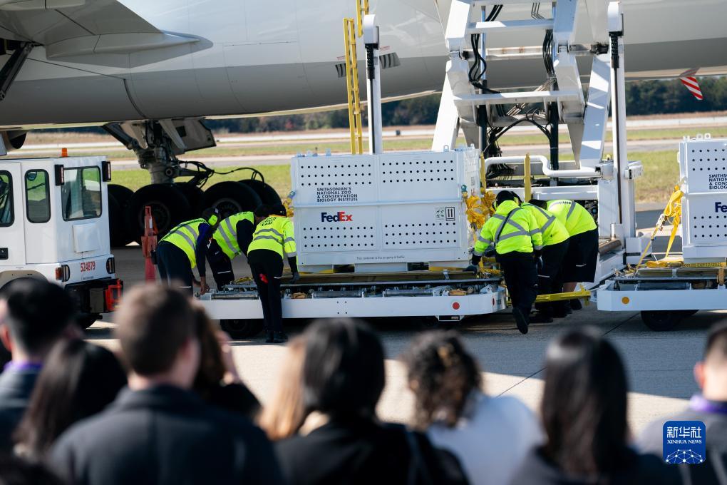11月8日,在美國(guó)弗吉尼亞州的華盛頓杜勒斯國(guó)際機(jī)場(chǎng),裝有大熊貓的特制“旅行包廂”運(yùn)上專機(jī)。新華社記者劉杰攝