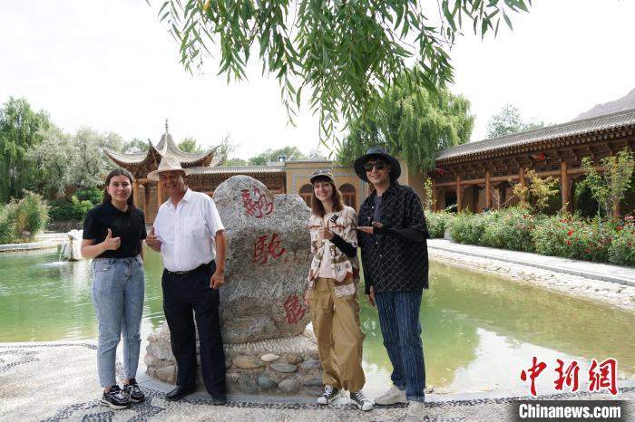 圖為青海省海東市循化縣撒拉族歷史文化地標駱駝泉內,唐一泓(左一)和當地講解員合影留念。 馬銘言 攝