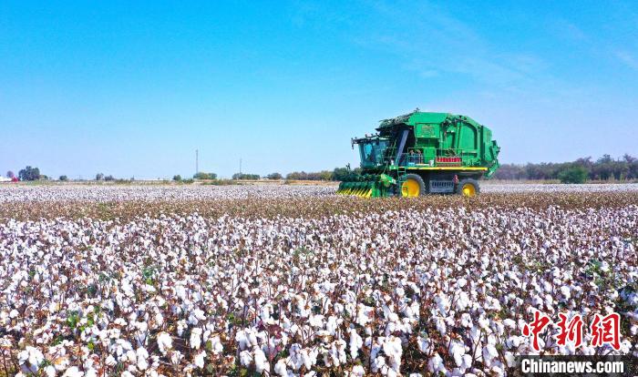 9月23日,在第六師103團(tuán)蔡家湖鎮(zhèn)一片靠近沙漠邊緣的棉田里,采棉機(jī)正采收棉花。(資料圖)李華北 攝