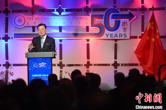 當(dāng)?shù)貢r(shí)間12月14日,美中貿(mào)委會(huì)成立50周年慶典活動(dòng)在華盛頓舉行。圖為中國(guó)駐美大使謝鋒致辭。中新社記者 陳孟統(tǒng) 攝