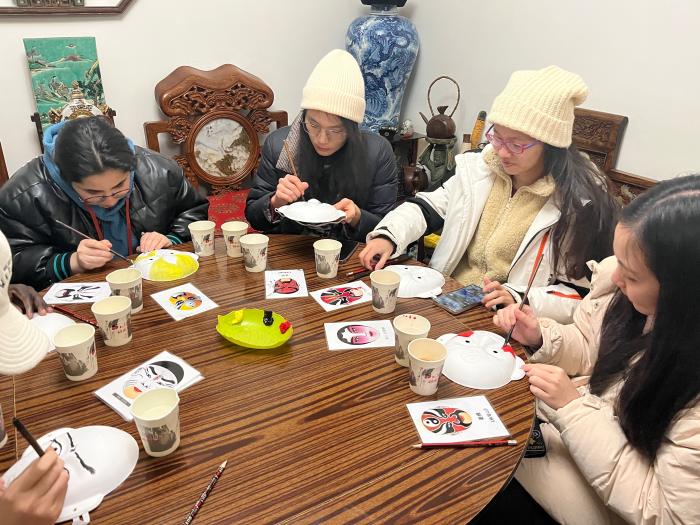 參觀完天壇之后,活動(dòng)的下一站是在老北京胡同里體驗(yàn)戲劇臉譜繪制。在了解臉譜文化的起源與發(fā)展后,留學(xué)生們紛紛對(duì)“紅臉關(guān)公” “白臉曹操”感到新奇,大家迫不及待地圍坐在小桌前,一筆一劃地勾勒出屬于自己的臉譜,一個(gè)個(gè)惟妙惟肖。