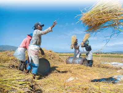 5月12日,在馬達加斯加首都塔那那利佛附近馬義奇鎮(zhèn)的中國國家雜交水稻工程技術研究中心非洲分中心,當?shù)剞r(nóng)民在雜交水稻高產(chǎn)示范田內(nèi)收割水稻。