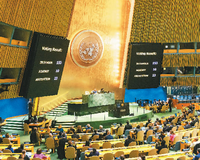 2023年12月12日,聯(lián)合國大會(huì)緊急特別會(huì)議投票通過決議,要求在加沙地帶立即實(shí)現(xiàn)人道主義?;稹D為會(huì)議投票現(xiàn)場。