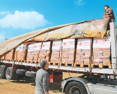 2023年11月27日,在埃及開羅,中國向加沙地帶提供的人道主義物資裝車等待發(fā)運(yùn)。