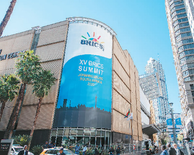 2023年8月23日,金磚國家領(lǐng)導(dǎo)人第十五次會(huì)晤在南非約翰內(nèi)斯堡舉行。圖為會(huì)場外景。